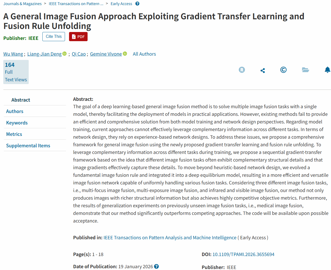 近日,西南财经大学新财经综合实验室最新的研究成果“A General Image Fusion Approach Exploiting Gradient Transfer Learning and Fusion Rule Unfolding”被人工智能领域顶级期刊IEEE Transactions on Pattern Analysis and Machine Intelligence (TPAMI)接收。实验室王武博士为论文第一作者,合作者包括电子科技大学邓良剑教授、本科生曹启以及意大利国家研究委员会研究员Gemine Vivone。